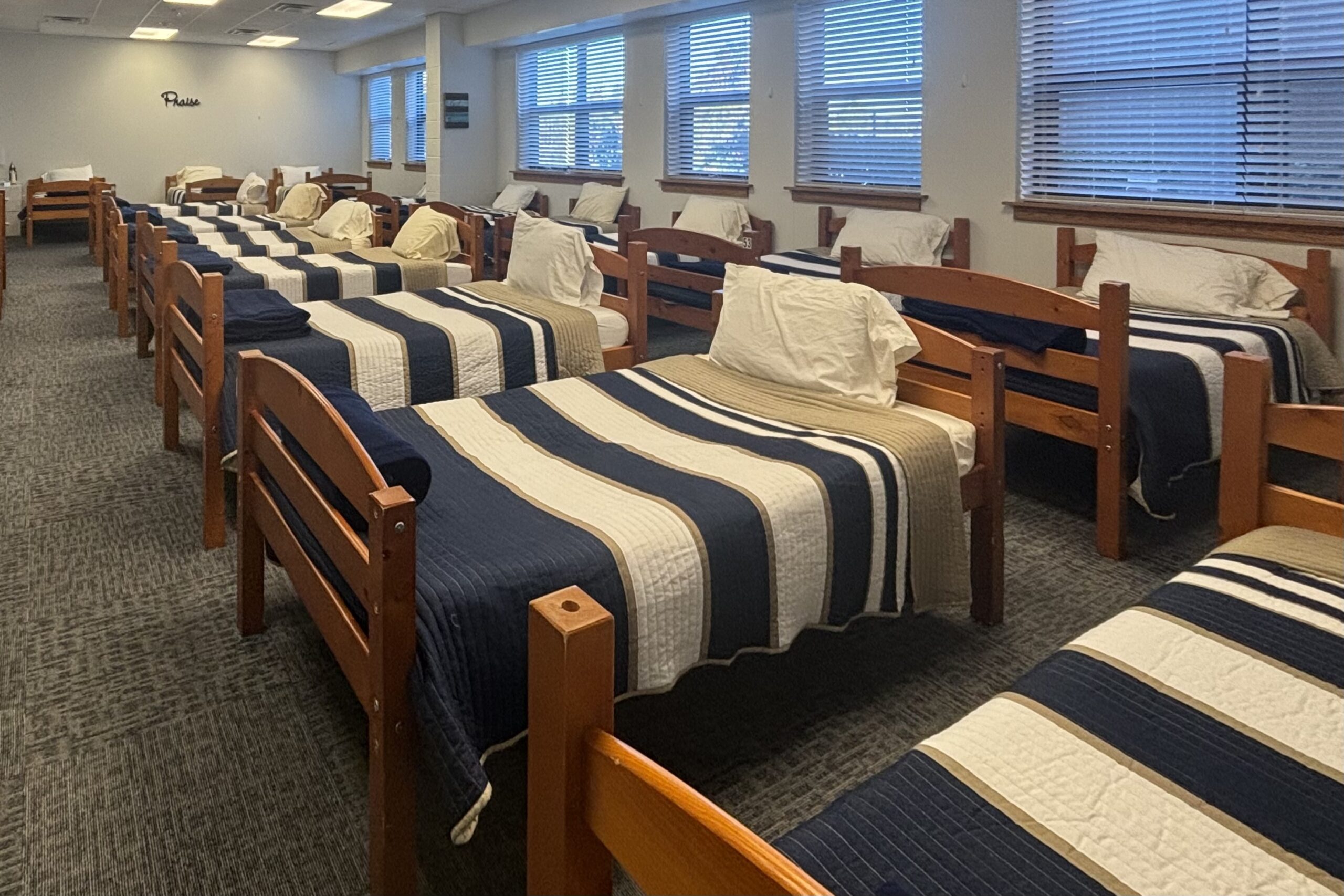 Our dorms accommodate up to 50 people in two separate rooms, each with large windows that let in natural light, creating a very comfortable atmosphere. There are two bath and shower rooms, each equipped with six private showers.