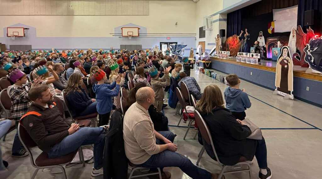 Gymnasium with a stage that has a large rear projection screen